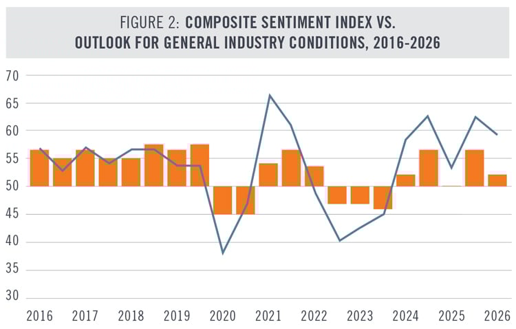 If every participant in the survey selected the most optimistic answer to every question, the index would be 100. Conversely, if all the participants chose the most pessimistic response to every question, the index would be 0. The survey includes questions that evaluate sentiment about conditions that are not included in the composite sentiment index score but are measured separately on a 100-point scale.