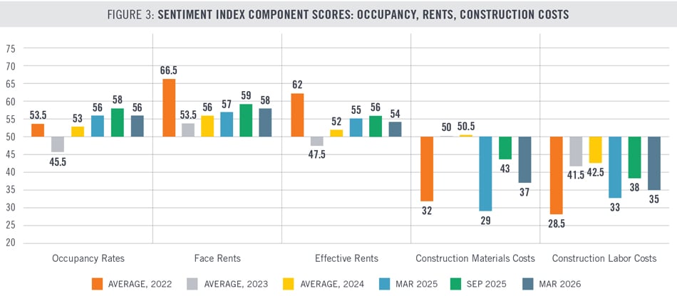 Figures 3 and 4 compare respondent expectations in March 2026 for the individual components that comprise the NAIOP CRE Sentiment Index with expectations in past surveys. For component scores from before 2022, please refer to past editions of this report. Values above 50 represent expectations that a condition will be more favorable for development over the next 12 months (for example, higher face rents, lower construction labor costs, lower cap rates). Values below 50 represent expectations that a condition will be less favorable during the next 12 months.
