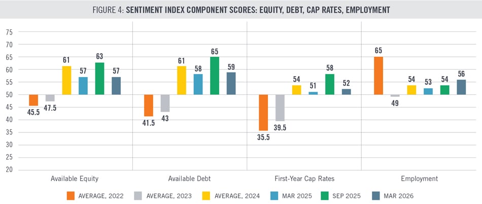 The largest changes in the March 2026 survey reflected a cooling outlook for capital market conditions, with respondents expecting a slower expansion in the availability of debt and equity, and a smaller decline in capitalization rates. Scores for each of these variables fell by six points but remained above 50, suggesting conditions will remain favorable. Other changes from the fall survey were relatively minor. Despite anticipating slower improvement in capital markets, developers and building owners expect to grow transaction activity at about the same pace as was expected in September (score of 60 vs. 62 in the fall).
