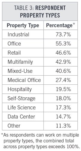 A total of 266 respondents from 237 distinct companies participated in this survey. A breakdown of the property types that respondents work on is provided in Table 3.