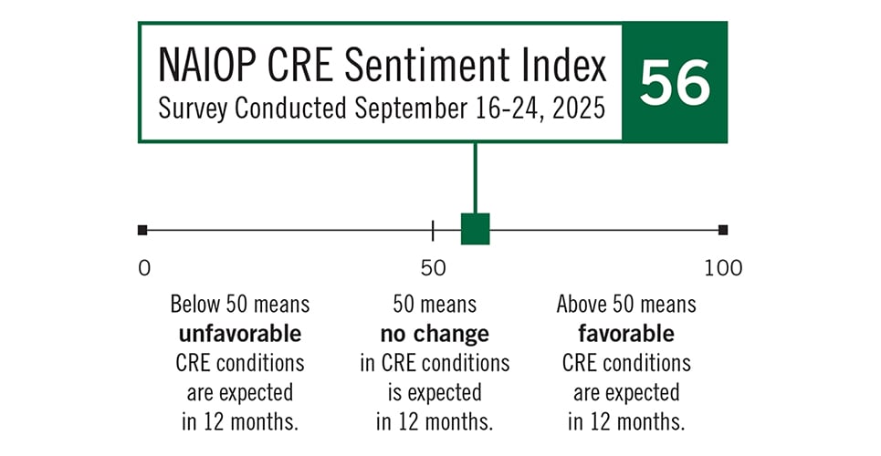 The NAIOP Sentiment Index is designed to predict general conditions in the commercial real estate industry over the next 12 months by asking industry professionals to predict conditions for their own projects and markets.