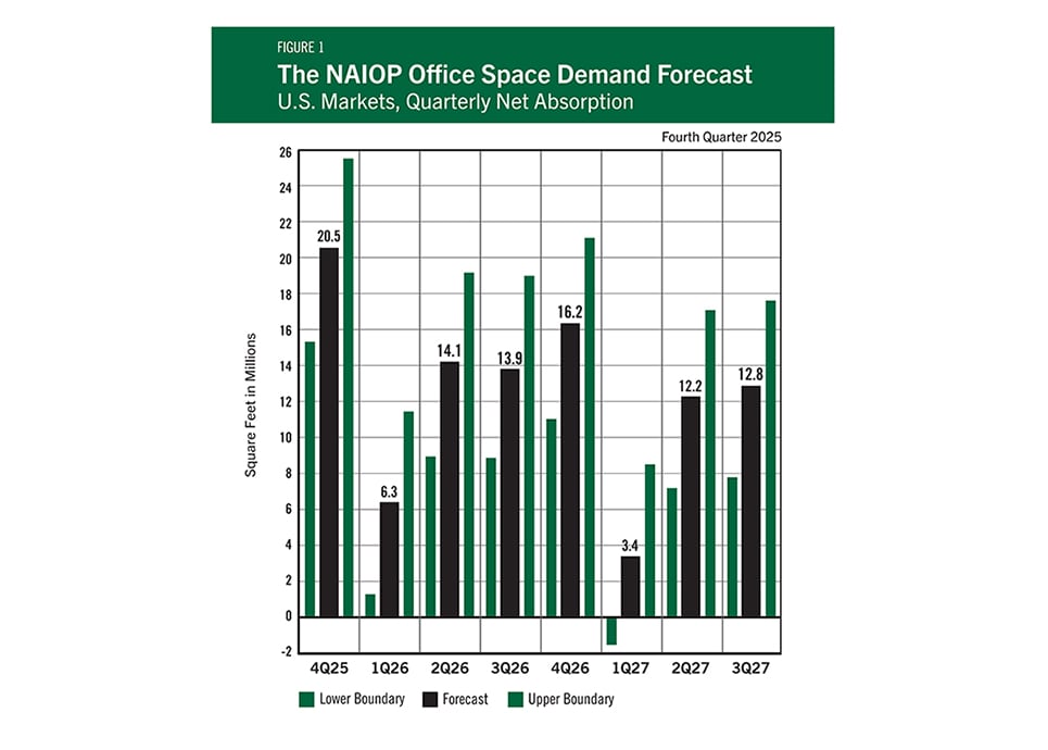 The NAIOP Office Space Demand Forecast is based on a predictive model that forecasts net absorption of U.S. office space on a quarterly basis for eight consecutive quarters.
