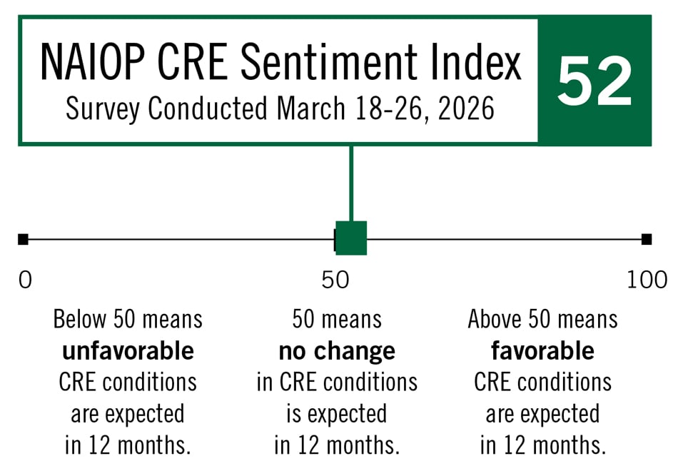 The latest NAIOP CRE Sentiment Index shows respondents continue to expect improvement across several key commercial real estate (CRE) indicators, but optimism has moderated as ongoing cost pressures and uncertainty weigh on development feasibility and near-term decision-making, according to the report.