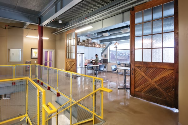 The structure’s original wooden delivery doors have been repurposed as sliding doors to an employee break room.