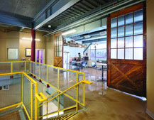 Features that remain from the original building include concrete floors, exposed rivets and ceiling braces, and a shaftless elevator with exposed workings. The original wooden delivery doors were reused as sliding panels to close off the employee break area. A large industrial crane hangs in the new lobby. The result is a blend of old large-scale industrial space with highly functional tech space and a large degree of flexibility.