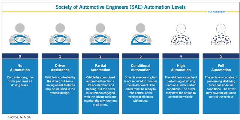 SAE International – a global association of 128,000 automotive and aerospace engineers, scientists and technical experts – defines vehicle automation in six steps, from Level 0 (no automation) to Level 5 (full automation). The levels differentiate the extent to which a car takes over tasks and responsibilities from its human driver, and how the car and driver interact.