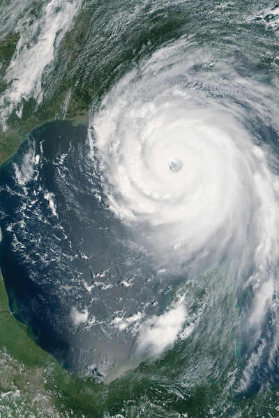 Hurricane Katrina approaches the U.S. Gulf Coast in this satellite image from August 2005. The storm killed more than 1,800 people and caused more than $100 billion in property damage. Getty Images/Stocktrek Images