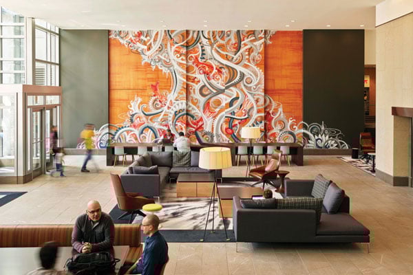 Key Center in Bellevue, Washington, is a 22-story tower. The lobby features a mural by artist Jonathan Wakuda Fischer that is spray-painted onto maple paneling. Spencer Lowell