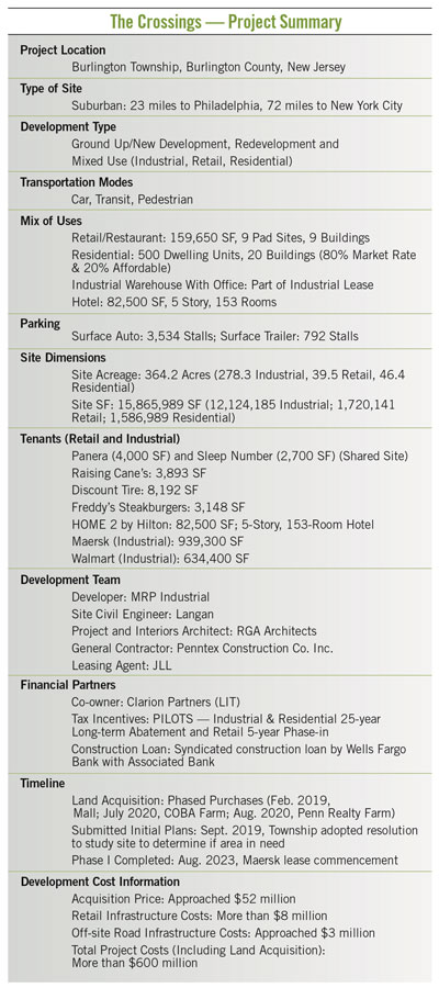 The recent transformation of Burlington Center mall into The Crossings in Burlington Township, New Jersey, could serve as a model for industrial-led, mixed-use redevelopment at other failed mall sites located near interstate networks and population centers. The ongoing six-year, more than $600 million redevelopment is one of the few instances where a former regional shopping mall has been reimagined as a mixed-use development integrating industrial/warehouse product along with complementary retail, multifamily and hospitality uses.