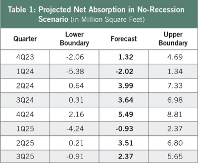 Table 1 provides the expected range in net absorption if a recession does not occur in 2024. Figure 1 assigns these values a 70% weighting. Table 2 assumes that the economy experiences a recession in the first half of 2024.