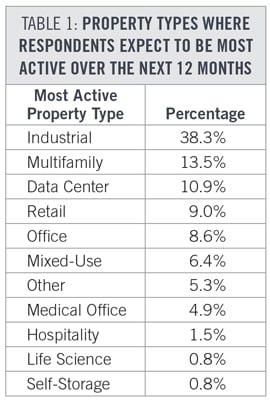 Most respondents expect to be most active in either industrial or multifamily real estate during the next 12 months (see Table 1). Data centers and retail properties attract the next highest levels of interest.