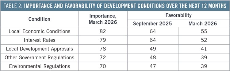 Respondents continue to rank local economic conditions and interest rates as the two most important factors influencing development decisions. However, favorability scores for both conditions declined meaningfully from September 2025. Respondents are less optimistic about the strength of local economic conditions and now expect interest rates to be only slightly favorable for development, suggesting increased caution around the broader economic and financing environment. Respondents are more pessimistic about local development approvals and other government regulations than they were in the fall survey, indicating that regulatory processes are expected to pose greater challenges to development over the next 12 months. Their outlook for environmental regulation also declined, reinforcing the view that regulatory conditions remain an obstacle to new development activity. These results suggest that respondents are less optimistic than they were six months ago about local economic conditions and interest rates, even though the relative importance of these development factors has not changed.