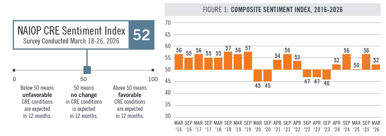 The NAIOP CRE Sentiment Index for March 2026 is 52, indicating that respondents expect slightly improving commercial real estate conditions over the next 12 months. The index declined from the September 2025 survey, suggesting respondents are less optimistic (see Figure 1).